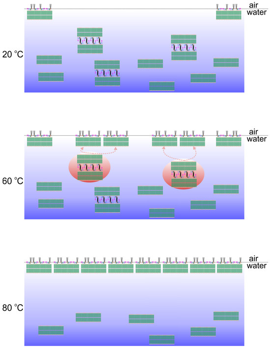 Due to the specific interrelationships between the PG-II tendencies and the components of the surrounding aqueous environment, the structural evolution of the two types of T4+LPS complexes, namely amphiphilic and “sandwich-like” entities, can be effectively regulated through temperature variations and the duration of the incubation times at the highest temperature values. The data evidence that upon heating, the sandwich-like species are “opened”/destroyed, becoming amphiphilic species (Scheme 1). This is fully in line with classical concepts about temperature-variation effects on hydrophobic interactions [23,24]. Upon heating the samples, the impact of thermal regulation results in the weakening of the H-bonded network in aqueous solution. Thus, the “sandwich”-type T4+LPS complexes that are formed because of hydrophobic interactions LPS+LPS at low temperature (20 °C) are “loosened” at higher temperatures (60 °C and 85 °C) and turned into amphiphilic T4+LPS complexes. Due to the innate amphiphilicity of the LPS molecules, these T4+LPS species are surface-active and effectively adsorb at the air–solution interface (Scheme 1). Therefore, the recovery to the initial sandwich-entities is actually impossible/incomplete at the cooling back to ambient temperature (20 °C) in the samples with air–solution interfaces. The higher the heating temperature (85 °C as juxtaposed to 60 °C), and the longer the incubation time at the highest temperatures of the respective thermal cycle (30 min as juxtaposed to 4 h), the more expressed this effect (see Figure 5a,b).