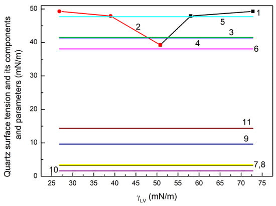The values of (curves 1 and 2 as well as lines 3–5), (line 6), (line 6), (lines 7 and 8), (line 9), (line 10) and (line 11) for quartz. Curves 1 and 2 are values calculated from Equation (3) based on the contact angle for W, F and D against their surface tension and LW component of this tension, respectively. Lines 3 and 4 are values calculated from Equation (4) based on the contact angle of W and D as well as F and D, respectively. Line 5 is the value of calculated from Equation (5) based on the contact angle of W, F and D. Line 6 are the values of and calculated from Equations (4) and (5), respectively. Lines 7 and 8 are the values calculated from Equation (4) based on the contact angle W and D as well as F and D respectively. Line 9 is the value calculated based on Equation (5) . Line 10 is value calculated from Equation (5) and line 11 is calculated from the same equation.