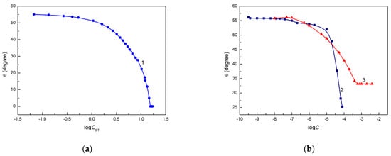 A plot of the contact angle for the aqueous solution of ethanol ((a), curve 1), rhamnolipid ((b), curve 2) and Triton X-165 ((b), curve 3) on the quartz surface vs. the logarithm of their concentration .