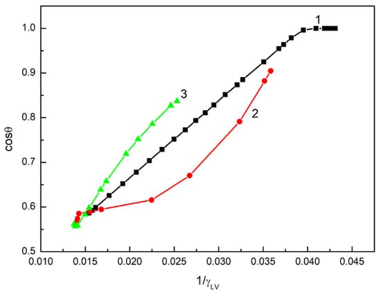 However, only in the case of the aqueous solution of ET is there linear dependence between the cosine of the contact angle and the reciprocal of its surface tension in the range of ET concentration, in which the contact angle on the quartz surface is higher than zero (Figure 3).