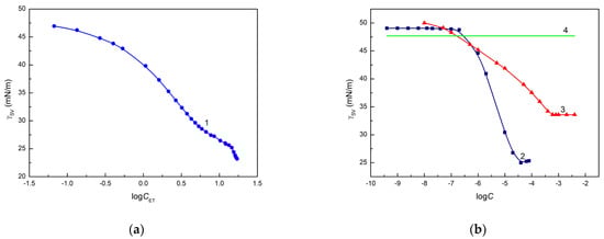 A plot of the quartz surface tension calculated from the Neumann equation (Equation (3)) based on the contact angle of aqueous solution of ethanol ((a), curve 1), rhamnolipid ((b), curve 2) and Triton X-165 ((b), curve 3) vs. the logarithm of their concentration () as well as the value of quartz surface tension calculated from the van Oss et al. equation (Equation (5)) based on the contact angle for water, diiodomethane and formamide (line 4).