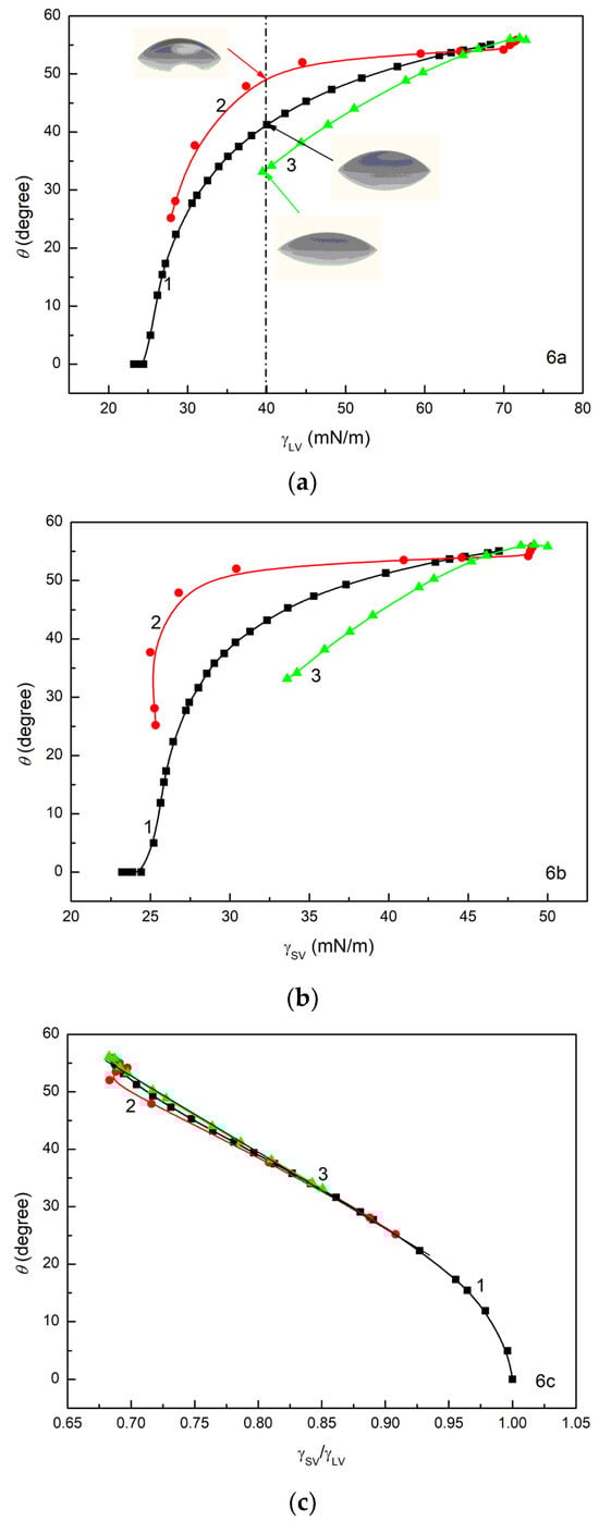 A plot of the contact angle () of aqueous solutions of ET (curve 1), RL (curve 3) and TX165 (curve 3) vs. the surface tension of solution () (a), the surface tension of quartz covered by the mixed layer () (b) and the ratio of surface tension of quartz covered by the mixed layer to the solution surface tension () (c).