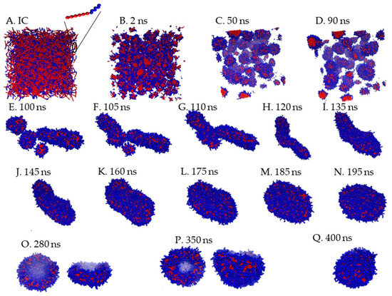 Intermediate states during vesiculation. The blue and red beads represent PEO and PB monomers, respectively. (A): homogeneous solution; (B–E): formation of spherical and cylindrical micelles; (E–H): merger of spherical and cylindrical structures to form a flexible wormlike micelle (WM); (H–L): reorganization of WM to form a rectangular lamella (RL); (L–N): formation of disklike lamella (DL); (O–Q): shape fluctuations of DL leading cavity and vesicle formation. For states (O,P), top and side views are shown.
