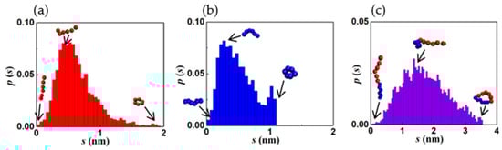 To understand the log normal variations in s, we conducted simulations to track the equilibrium configuration dynamics of a single chain in a solution. An analysis of the data collected for the instantaneous values of qPEO and qPB showed that the chain stretch parameter s follows log-normal distribution for PEO and PB segments as well as the entire diblock chain, as shown in Figure 5. The fitting parameters are provided in Supplementary Materials as Table S5. Consequently, the pdfs of s for assemblies of individual polymer chains are also log-normal. The qualitative agreement of p(s) to a log normal distribution might have implications in terms of entropy maximization. Specifically, a log normal distribution maximizes the information entropy of a random variable with prescribed values of both the mean and variance [80]. The average segmental stretch and configurational fluctuations are bounded by the ring-like and fully stretched states of the segments. The skewness and kurtosis in the distributions appear to depend on the aggregate shape. This suggests that the details of molecular packing within the aggregates are topology dependent. Further investigations are needed to quantify such structure–topology relationships.
