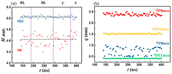 To investigate whether vesicle formation is entropy driven, we calculated the information entropy, H, along the vesiculation pathway within the constant N regime. Figure 6a shows that H values for the PB and PEO segments remain practically unchanged during the vesiculation process, with HPEO and HPB = 4.62 ± 0.10 nat and 5.02 ± 0.02 nat, respectively. Figure 6a also shows that HPB exhibits relatively larger fluctuations. Upon examining qmax and qmin (Figure 6b), we find that, for PEO, qmax and qmin remain practically constant along the vesiculation pathway. However, for PB, qmax shows negligible changes while qmin undergoes relatively large fluctuations. This observation can be attributed to the fact that qmax is related to the fully stretched segment length, which does not change substantially. On the other hand, qmin is associated with the shortest coiled configurations. Based on their chemical structures, the parameter Kθ in the bending potential function for PB is smaller than that for PEO (Kθ = 25 kJ/mol and 50 kJ/mol for PB and PEO, respectively) [75,81]. A lower Kθ value results in greater fluctuations of the coiled configurations. In the absence of systematic statistically significant variations in the information entropy, we conclude that entropic driving forces are not responsible for vesiculation in the system studied.