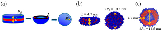We now examine the energetics-based mechanism proposed for lamella-to-vesicle transition [27,34]. Towards this end, we compare the relative change in the surface area ΔS ≡ 1 − Sv/Sd associated with the transition where Sv and Sd denote the surface area exposed to the solvent for the vesicle and disklike lamella, respectively. For an ideal lamella of radius Rd and thickness L, Sd = 2πRd2(1 + L/Rd). If such a lamella bends, curves, and folds to form an ideal vesicle of radius Rv, the resulting surface area Sv = 4π [Rv2 + (Rv − L)2], where Rv ≈ Rd/2. However, this assumes perfect geometric shapes and that the packing density is conserved during the structure transition process. To assess the impact of such non-idealities on ΔS, we also compute Sd and Sv directly from the simulations. The procedure is illustrated in Figure 7 for the ideal (Figure 7a) and actual (Figure 7b) cases for Rd = 9.9 nm and L = 4.7 nm. Figure 7b,c show that the bilayer thickness L remains unchanged during the lamella-to-vesicle transition, as assumed in classical theoretical models. However, the radius of the resulting vesicle is significantly larger than that predicted by ideal geometric conditions, i.e., simulations yield Rv/Rd = 0.73. This implies that the size of the water core and, consequently, the surface area of the vesicles formed are larger than those predicted by models that use ideal geometric representations of the self-assembled structures. This translates to a smaller value of ΔS ≈ 0.18, predicted by the simulations, vs. ΔS ≈ 0.66, calculated for idealized structures.