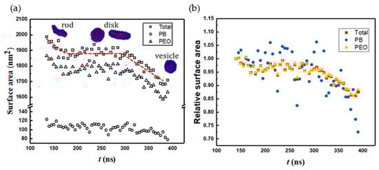Figure 8 shows the change in solvent-accessible surface area (SASA) along the vesiculation pathway. Note that SASA is different from the macroscopic surface area calculated from the linear geometric dimensions shown in Figure 7: specifically, as explained in [30], SASA computations incorporate interfacial area variations on the scale of the monomer bead size. Figure 8a shows that the PEO–water interface accounts for nearly 95% of the cumulative SASA. Moreover, SASA decreases continuously during rod-to-RL and DL-to-vesicle transitions. However, as the RL reorganizes into a DL, SASA is unchanged. This observation is consistent with the changes in the packing density during vesiculation shown in Figure 9. Specifically, during the transition from RL to DL, the packing density and SASA are unaffected. Furthermore, although the SASA associated with PB segments is much smaller compared to that of PEO, the relative change in SASA during rod-to-vesicle transition of the PB segments (≈0.3) is significantly greater than that of PEO segments (≈0.1). This observation supports the edge energy hypothesis [1,13,27,29,31,32,33,34,35] that the unfavorable edge energy of the hydrophobic boundaries is the driving force for vesicle formation. The quantitative differences in SASA between theoretical and simulation predictions can be attributed to the shape imperfections of the aggregates and changes in the packing density. Figure 9 clearly shows that the polymers within the vesicle are more compactly packed as compared to those in the lamella. The reduction in SASA manifests as lower energies of a polymer–solvent interaction, as shown in Figure 10. Specifically, the (non-bonded) interaction energy of either PB or PEO segments with water is seen to become less negative during vesiculation.