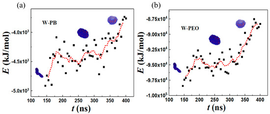 Total non-bonded pairwise interaction energy for (a) water-PB (b) water-PEO. Black squares denote the simulation data and red dotted line represent the moving average of the data.