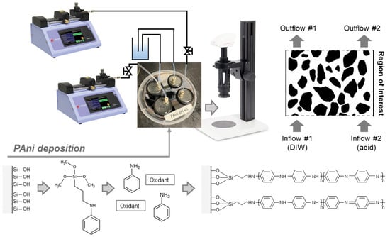 Figure 2 also provides a schematic of the setup for experiments. The completed micromodel functionalized with PAni is examined under a stereo microscope (Leica Z6 APO, Deerfield, IL, USA) that is linked to a computer for image capture and recording. Fluid injections are administered using two 5 mL glass syringes (Hamilton Gastight Syringe, Reno, NV, USA) attached to the syringe pumps. Differently concentrated HCl is used in coninjection with DI water (pH ≈ 5.8 at room pressure).