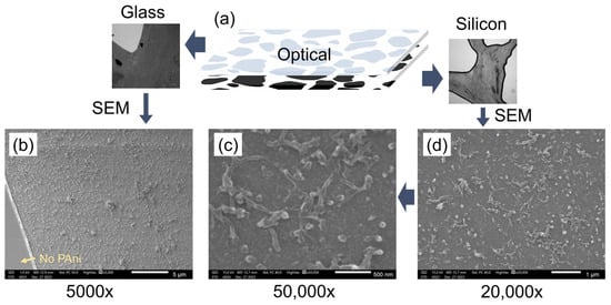 Characterization of PAni deposited in the microfluidic device: (a) schematic of the microfluidic porous media detaching the top glass plate (with optical microscopic image on the left side) and the bottom silicon substrate (with optical microscopic image on the right side); (b) SEM image of PAni deposited on the glass surface at 5000× (bottom-left corner with no deposition); (c) the shape of deposited PAni on silicon at 50,000× by SEM; (d) SEM characterization of the PAni deposited on the bottom silicon substrate at 20,000×.