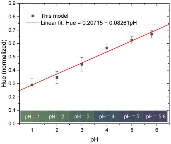 This entire procedure was repeated three times, allowing us to estimate the error, as highlighted by the error bars in Figure 4. Notably, the error observed during calibration was minimal. After correlating the hue values with their respective pH levels, we derived a linear relationship between hue and pH. In research conducted by Florea et al. [], a sigmoidal curve was fitted to represent the relationship between hue and pH. However, our observations indicated that in the alkaline regime (pH > 7), hue is not sensitive to pH changes. Between pH = 2 and pH = 6, the relationship is linear. Our findings further corroborate this observation. Given our specific interest in measuring acidic solutions, we opted for a linear curve to simplify the hue–pH relationship. This simplified relationship was then employed to back-calculate the pH in subsequent experiments.