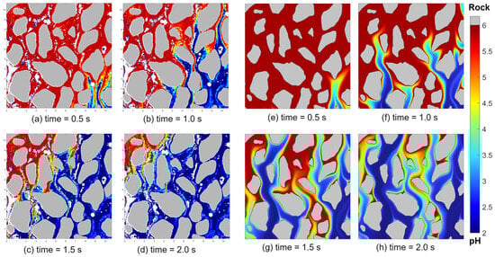 Measurement of rapid pH changes in the pore space when swept by HCl acid solution (pH = 2) displacing DI water (pH = 5.8) from the lower right side. (a–d) showcase the experimental results of the pH changes, with the gray color representing rock grains at increasing elapsed times. (e–h) display the corresponding direct numerical simulation results as the acid sweeps through the model.
