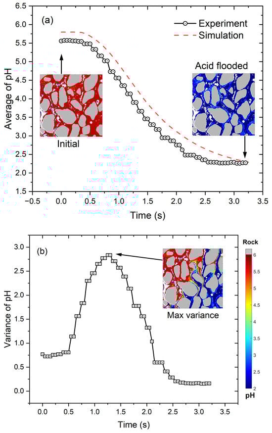 Average pH and variance of pH within the pore space imaged: (a) the average pH and the flow of acidic solution into the pore space results in smoothly decreasing pH. (b) The variance in pH highlights the heterogeneity of its distribution within the pore space.