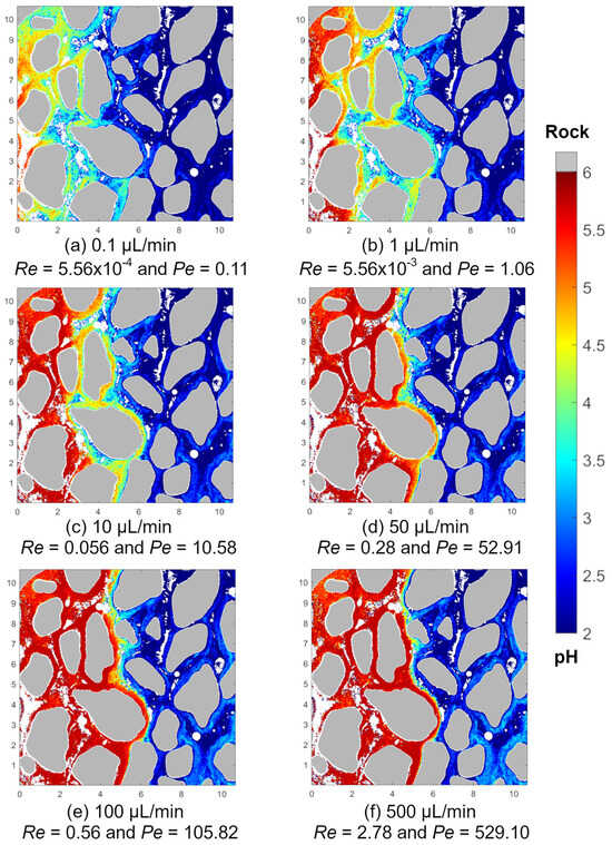 Figure 7 illustrates the pH distribution in the porous medium during the coinjection of two fluids at varying flow rates. At a minimal flow rate of Q = 0.1 µL/min, the associated Pe is merely 0.1. In this regime, the effect of diffusion is evident, resulting in a broad transition zone of pH between the two injected fluids, with pH ranging from 2 to 5.8. It is essential to note that while pH logarithmically represents hydrogen ion concentration [H+], diffusion predominantly follows a linear process. Consequently, as depicted in Figure 7a, a high pH value is confined to a narrow band on the figure’s left side, with most of the porous medium presenting a transition from the acidic small pH to DI water with a larger pH.