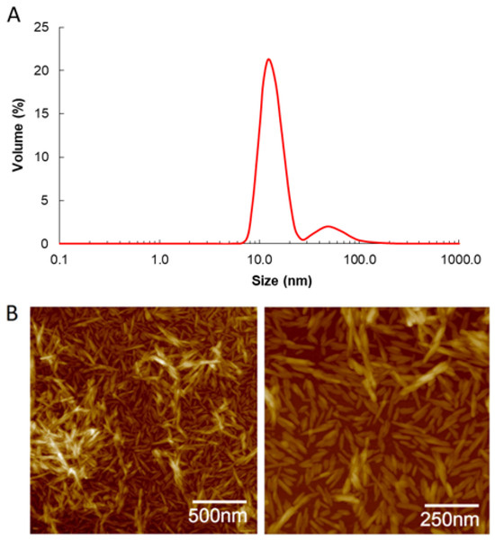Particle size distribution measured by DLS (A) and AFM topographic images (B) of CNC.
