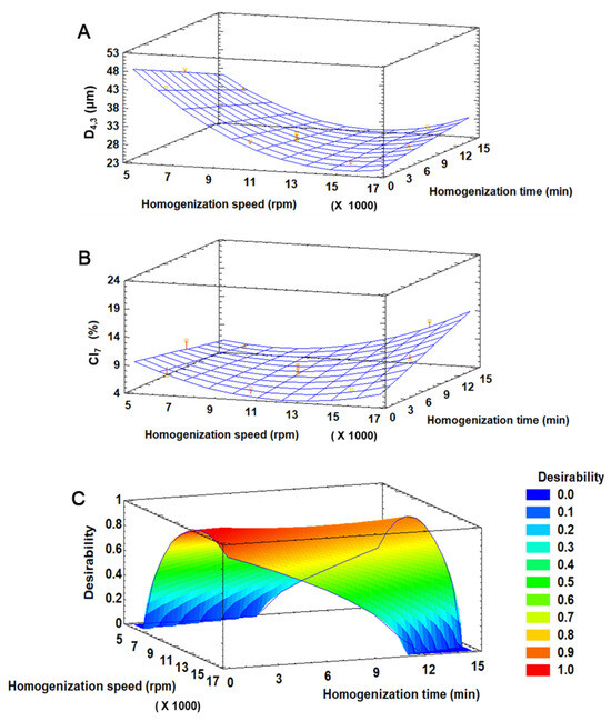 In the equation, terms that were not statistically significant (p > 0.05) were eliminated, with the exception of linear forms of the homogenization speed or homogenization time, which are fundamental components of the mathematical model. The software program Statgraphics Centurion XVI, version 16.2 (Statistical Graphics Corporation, Rockville, MD, USA) was used to perform the analysis of variance (ANOVA), lack-of-fit, and the determination of regression coefficients. The optimal conditions for each independent variable were determined by the response surface methodology (RSM). Multiple optimization of the response variables, where CI7 and D4,3 were minimized, was performed using the desirability function.