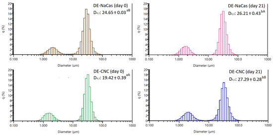 The distribution of oil droplet sizes, and D4,3 values of freshly prepared DE-NaCas and DE-CNC, and after 21 days of storage at 4 °C. Different uppercase letters (A, B) denote significant differences (p < 0.05) observed among DE samples at the same storage period. Different lowercase letters (a, b) represent significant differences (p < 0.05) observed for the same sample over the course of storage.