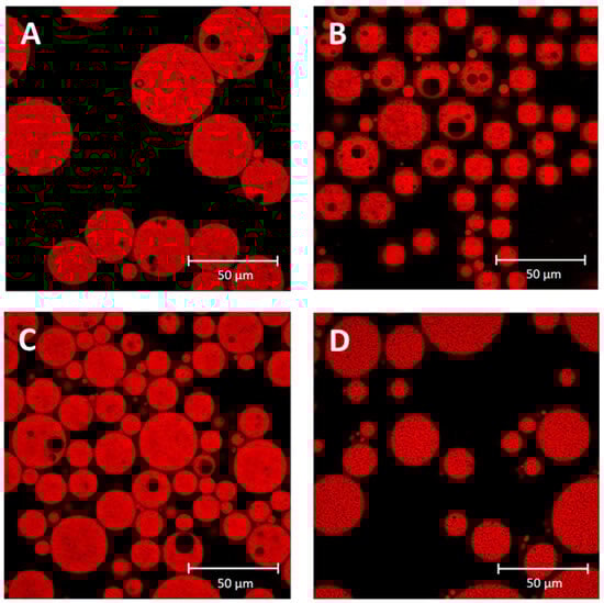 Confocal laser scanner microscopy (CLSM; LSM 700, Carl Zeiss Microscopy GmbH, Jena, Germany) was used to evaluate the microstructure of DEs at days 0 and 21 of storage at 4 °C. The oil phase was fluorescently labelled with Nile red (0.01% w/w; excitation and emission wavelengths of 488 nm and 580 nm, respectively). The CLSM images were analyzed with the ZEN 2012 (Blue Edition, Carl Zeiss Microscopy GmbH, Jena, Germany) software.
