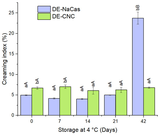 Creaming index (CI) (%) of DE-NaCas and DE-CNC stored 21 days at 4 °C. Distinct lowercase letters (a, b) denote significant differences (p < 0.05) observed between DEs at identical storage times. Different uppercase letters (A, B) denote significant differences (p < 0.05) for the same DE throughout the storage period.