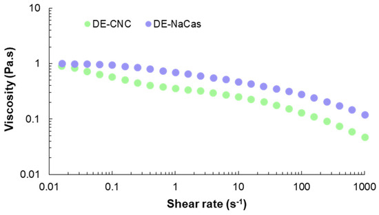 The flow curve recorded at 25 °C for both studied DEs is presented in Figure 6. Although both DEs showed similar initial viscosity at the onset of the shear rate sweeping (1 Pa·s at 0.02 s−1), DE-NaCas showed higher viscosity values than DE-CNC across the entire range of tested shear rates, due to the viscosity imparted by 3% pectin in W2. The presence of pectin leads to a higher effective volume fraction of the dispersed phase due to its relatively large and flexible structure. Additionally, pectin molecules can interact with each other through hydrophobic interactions and hydrogen bonding, contributing to the high observed viscosity [37]. The viscosity of CNC-stabilized Pickering emulsions is attributed to the formation of a three-dimensional network between nanoparticles and water molecules by van der Waals forces, electrostatic forces, and hydrogen bonds [44]. Both DEs presented a non-Newtonian behavior, with viscosity values decreasing as the shear rate increased, depicting a pseudoplastic behavior. Interestingly, in the case of DE-CNC, three regions were distinguished in the flow curve: a shear thinning regime at low strain (<0.1 s−1), a Newtonian-plateau at strain values within the range 1–10 s−1, and a further decrease in viscosity at strains above 100 s−1. This rheological behavior has been described as typical for lyotropic liquid crystals [45] and has been previously reported in CNC suspensions [46] and CNC-stabilized emulsions [44]. Herein, the shear thinning behavior could be explained by the alignment of the chiral domains of the liquid crystal in the flow direction, and revealing that interaction between oil phase, water phase and solid emulsifier were weak [44]. This behavior has been previously observed in Pickering emulsions due to the absence of any chemical bonds [44]. The Newtonian-plateau would be related with the CNC concentration, suggesting that CNC-stabilized DEs may undergo microstructure change at higher shear rates [47].