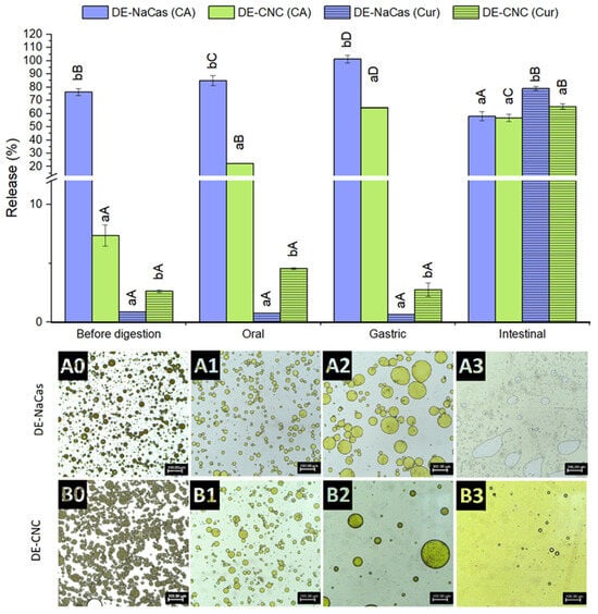 CA and curcumin released from DE-NaCas and DE-CNC before digestion and after oral, gastric, and intestinal phases of an in vitro gastrointestinal digestion. Microstructure of DEs (A: DE-NaCas and B: DE-CNC) before (0), and after oral (1), gastric (2), and intestinal (3) phases of an in vitro gastrointestinal digestion. Different lowercase letters (a, b) indicate significant differences (p < 0.05) among DEs for the same phase of digestion. Different uppercase letters (A–D) indicate significant differences (p < 0.05) among the different digestion phases for the same sample.