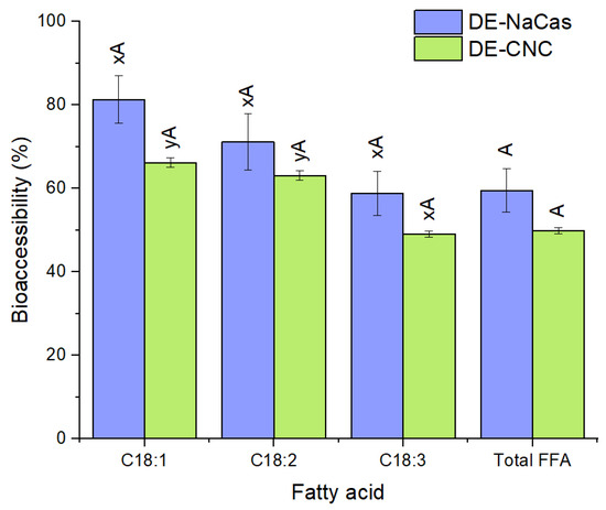 The fatty acids released after the intestinal phase of digestion were used to evaluate the extent of DE lipolysis. Figure 8 shows the bioaccessibility of the total FFA and the major individual fatty acids at the end of the intestinal phase of the in vitro gastrointestinal digestion of DE-CNC and DE-NaCas. Although the bioaccessibility of the total FFA in DE-CNC and DE-NaCas was statistically similar (p > 0.05), the values tended to be lower in DE-CNC (49.91 ± 0.77%) than in DE-NaCas (59.54 ± 5.17%), suggesting that CNC may hinder lipase access to the oil droplets, in line with the lower bioaccessibility values observed for curcumin. A significantly lower extent of lipolysis has been reported in other studies where CNC-stabilized o/w emulsions have been subjected to in vitro digestion. This has been attributed to the CNC irreversibly adsorbed to oil droplets, which limits the adsorption of bile salts and lipases [49].