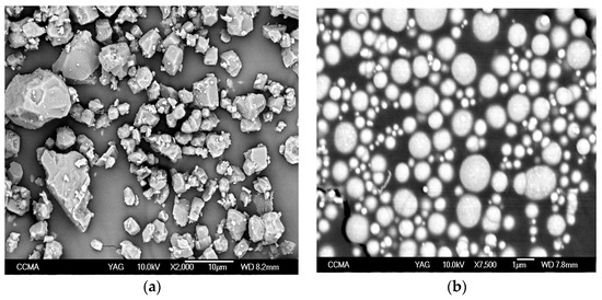 The suspensions used are based on two kinds of particles, a CC powder produced by the company Omya, Oftringen, Switzerland, with the trademark BL200, and a CI powder (grade HQ produced by the company BASF, Ludwigshafen, Germany), which is currently used in the preparation of magnetorheological (MR) fluids [33,34]. The interest of MR fluids in the frame of the DST transition is that critical stress can be changed by the application of an external magnetic field [35,36]. The CC particles have an irregular shape, mainly rhomboidal (Figure 1a), whereas the CI particles are spherical (Figure 1b).