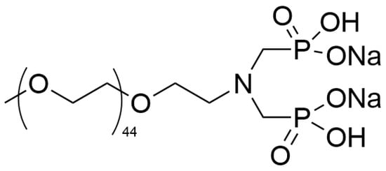 The size distribution was obtained by analyzing, with the software ImageJ (ij154-win-java8), several images such as the ones presented in Figure 1a,b from scanning electron microscope (SEM) JEOL JSM 6700 (TEM, Tokyo, Japan). It is well represented by a lognormal distribution whose average radius and standard deviation are, respectively, aCC = 1.75 μm and σstd_CC = 0.809 μm and aCI = 0.297 μm and σstd_CI = 0.15 μm. A plot of the size distributions can be found in [35]. The densities of the particles were measured with a gas pycnometer (Accupyc II, Micromeritics, Norcross, USA), and ρCC = 2.72 g/cm3 and ρCI = 7.7 g/cm3. The superplasticizer is a polyelectrolyte whose commercial name is Optima 100 from Chryso company, Sermaises, France. It is made of a polyoxyethylene (PEO) chain of 44 units with a diphosphonate head (Figure 2). The counterions of the phosphonate group are sodium ions. The polymer is solvated in water at a concentration of 30 wt.%. The phosphonate head, negatively charged, binds with the positive ions, either calcium or iron, depending on the particles used. The suspending fluid is made of a mixture of ethylene glycol and de-ionized water (with resistivity of 18 MΩ·cm) in the ratio of 85–15%; it was chosen to minimize the evaporation of the solvent.