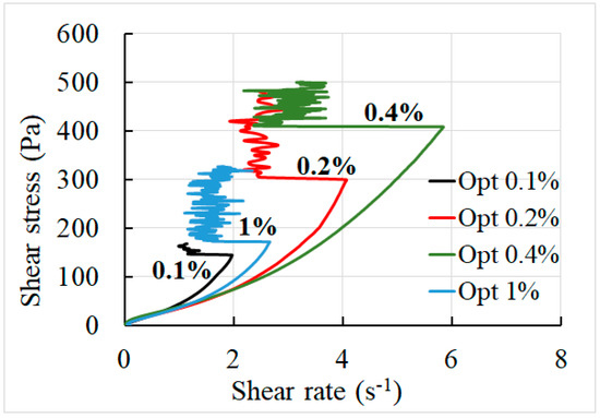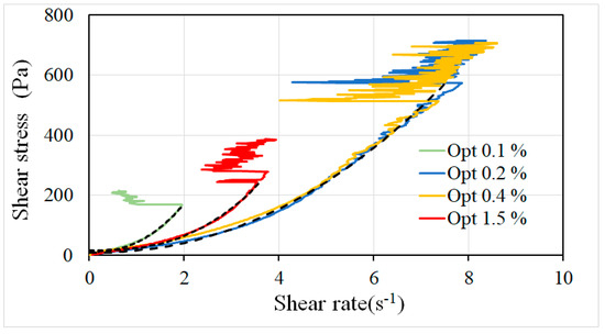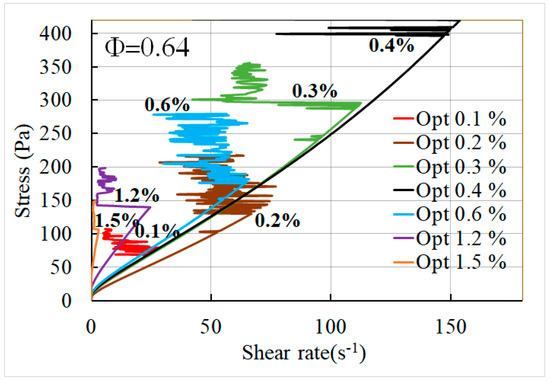 The stress shear rate curve is given in Figure 3 for different weight percentages of the superplasticizer Optima 100; the total volume fraction being ΦCC = 68%. It should be emphasized that, in the absence of Optima 100, it is not possible to obtain a flowing suspension at this volume fraction. In this figure, like in Figure 4 and Figure 5, it can be noted that the shear rate is unstable above the critical shear stress. This is a common feature found in DST transitions where the differential viscosity becomes negative and produces an instability on the shear rate at imposed shear stress [25,26,27,36].