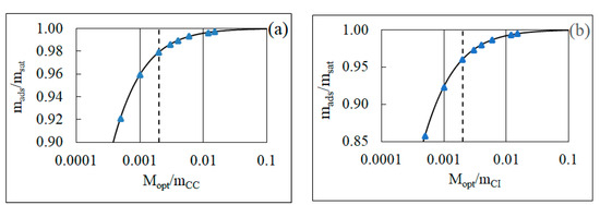 Coverage fraction of plasticizer molecules deduced from the Langmuir isotherms for the weight fractions used in the rheological experiments: (a) for CC particles and (b) for iron particles. The dashed vertical lines correspond to Mopt/mCC = 0.002 = 0.2 wt.%.