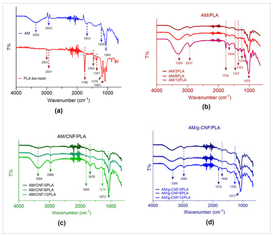 FTIR of (a) AM, PLA bioresin, (b) composite films of AM/PLA, (c) AM/CNF⁄PLA, (d) AM/g−CNF⁄PLA.