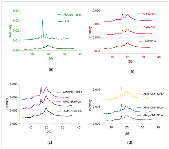 WAXS of (a) AM film and WAXS of composite films of (b) AM/PLA, (c) M/CNF-PLA, (d) AM/g-CNF-PLA.
