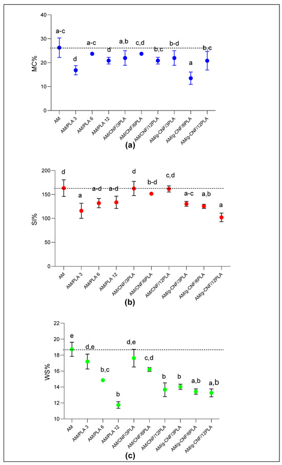 Physical properties of the composite films: (a) moisture content (MC %), (b) swelling index (SI %), (c) water solubility (WS %). Different letters represent statistical differences (p ≤ 0.05).