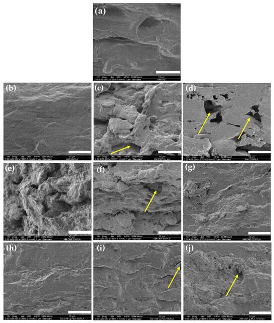 SEM images of the cross-section of; (a) AM film, (b–d) AM/PLA composite film, (e–g) AM/CNF/PLA, and (h–j) AM/g-CNC/PLA composite film. Arrows point to voids. Scale bar, 10 µm.