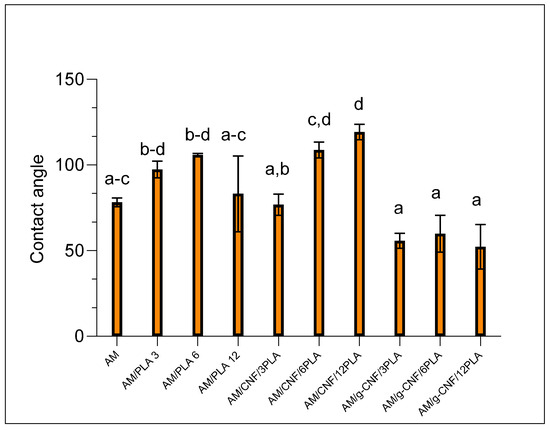 The wettability analysis of the composite polymeric films achieved by using the sessile drop method (Figure 5) revealed the hydrophilic nature of AM (contact angle < 90°), which decreased in AM/PLA composites and AM/CNF/PLA (CA > 90°), demonstrating the hydrophobic characteristics of PLA and that it significantly possessed higher wettability with composite AM/CNF/12PLA compared to AM as a control. For the AM/g-CNF/PLA composites, inclined results were observed. It was expected that the presence of g-CNF could increase the water repulsion; however, it was lower (contact angle < 90°) with no significant differences between the composites, and this might be due to the aggregation of g-CNF, resulting in phase separation between the AM and PLA matrices.