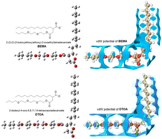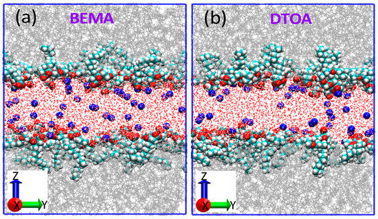 Surfactants (BEMA and DTOA) were geometrically optimized using the B3LYP density functional method [] and the 6-31G** basis set [] to conform the structural topology for more realistic molecular dynamics simulation conditions. 3D structural models of these molecules are shown in Figure 1. The van der Waals potential was visualized for this system in Figure 1.