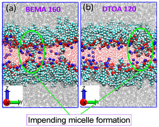 The following supporting information can be downloaded at: https://www.mdpi.com/article/10.3390/colloids8040041/s1, Table S1: Number of molecules for each component in the MD model; Figure S1: Snapshots of the equilibrium state of MD simulations with different concentrations of BEMA; Figure S2: Snapshots of the equilibrium state of MD simulations with different concentrations of DTOA.