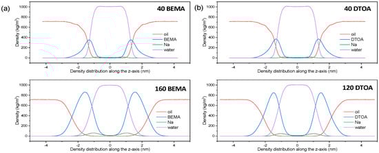 The interfacial thickness is one of the critical parameters in the surfactant MD simulation system, which is related to the density distribution of the system. In order to study the effect of the number of surfactants on interfacial thickness, the density distributions along the -z-axis of BEMA and DTOA were counted in Figure 4. In all MD models, the densities of the water and oil phases were constant at 999 kg/m3 and 738 kg/m3, respectively, which was consistent with the experimental values for water (997 kg/m3, 298 K) and oil (decane, 735 kg/m3, 298 K). The surfactant was fully concentrated in the oil–water interfacial film, and the thickness of the interfacial film in the model was evaluated using the “90~90” interfacial thickness criterion proposed by William A. Goddard III et al. []. With 40 surfactant molecules, the interfacial film is thin, and when a certain amount of surfactant is added (BEMA: 160 and DTOA: 120, Table 2), the interfacial thickness of the oil–water interface increases because oil and water penetrate the alkyl tails and polar groups, respectively.