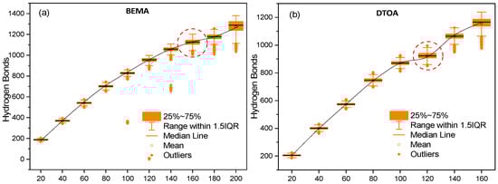 Hydrogen bond interaction is an effective parameter for evaluating the strength of the interaction between surfactant and water, and the hydrogen bond distributions for all models are statistically presented in Figure 5. In these models, the counted hydrogen bonds included the hydrogen bonds formed between the oxygen atoms in the surfactant and the hydrogen atoms of the water molecule, which made the surfactant exhibit certain hydrophilic properties. An apparent universal regularity was that the number of hydrogen bonds all showed a similar linear increase as the number of surfactant molecules increased because more molecules would form hydrogen bonds with more water molecules. When the number of surfactant molecules increased to a certain extent, the number of hydrogen bonds reached a relative maximum. The number of hydrogen bonds continued to grow only when the surfactant molecules further increased. At this time, a bend in the interface occurred and surfactants could form additional hydrogen bonds with water molecules, resulting in better hydrophilicity. Therefore, this inflection point (at the red dashed line in Figure 5) could effectively determine whether the surfactant reached saturation at the water–oil interface. This is consistent with the results of the previous visualization snapshots.