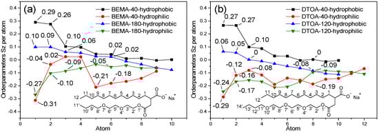 The order parameters (in the z-axis direction) of the hydrophobic, long, alkyl chains and nonionic chains of BEMA and DTOA were counted, respectively, as shown in Figure 6. In Figure 6, the variation rule of the order parameter of the hydrophobic, long, alkyl chains of all models was almost the same; the carbon atoms close to the polar groups had higher-order parameters, and the order parameter gradually decreased with the extension of the carbon chains. However, the values of the order parameter for the first three carbon atoms were significantly higher than the others under a system with 40 surfactant molecules. One main reason is that the solvent effect at lower concentrations did not significantly affect the surfactant. However, the rigidity of surfactant molecules is the main reason concerning the degree of order parameter of the first three carbon atoms. At higher concentrations, the weak interactions (including hydrogen bonds and van der Waals interactions) of surfactants with water and oil reduced the order parameter of these carbon atoms.