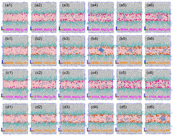 Equilibrium snapshots of salt-containing simulation models, all of which contain 80 surfactants, with gray lines for oil molecules, red dots for water molecules, cyan for surfactant molecules, blue spheres for sodium ions, cyan spheres for chloride ions, magenta spheres for magnesium ions, and orange spheres for calcium ions. (a1) BEMA in 10 MgCl2; (a2) BEMA in 20 MgCl2; (a3) BEMA in 30 MgCl2; (a4) BEMA in 40 MgCl2; (a5) BEMA in 50 MgCl2; (a6) BEMA in 60 MgCl2; (b1) BEMA in 10 CaCl2; (b2) BEMA in 20 CaCl2; (b3) BEMA in 30 CaCl2; (b4) BEMA in 40 CaCl2; (b5) BEMA in 50 CaCl2; (b6) BEMA in 60 CaCl2; (c1) DTOA in 10 MgCl2; (c2) DTOA in 20 MgCl2; (c3) DTOA in 30 MgCl2; (c4) DTOA in 40 MgCl2; (c5) DTOA in 50 MgCl2; (c6) DTOA in 60 MgCl2; (d1) DTOA in 10 CaCl2; (d2) DTOA in 20 CaCl2; (d3) DTOA in 30 CaCl2; (d4) DTOA in 40 CaCl2; (d5) DTOA in 50 CaCl2; (d6) DTOA in 60 CaCl2.