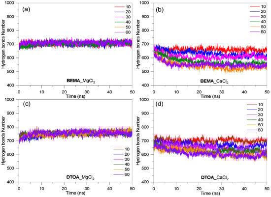 In order to study the effects of magnesium chloride and calcium chloride on surfactant properties, the hydrogen bonds of surfactants were counted and are shown in Figure 8. In the BEMA system, the MgCl2 solution showed an insignificant effect on the number of hydrogen bonds (Figure 8a). However, in the CaCl2 system, the number of hydrogen bonds showed a regular decrease with the increase in CaCl2 concentration (Figure 8b). A similar rule was shown for DTOA in the MgCl2 and CaCl2 systems (Figure 8c,d). The curve of the number of hydrogen bonds shows that the surfactant molecules have two different adsorption behaviors for magnesium and calcium ions.