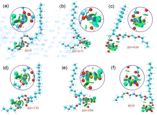 In order to study the critical factors of hydrogen bond changes in MgCl2 and CaCl2, the weak interaction for BEMA in aqueous MgCl2 and aqueous CaCl2 solutions was analyzed by IGMH (Figure 9). Figure 9a–c shows the distribution of the weak interaction of magnesium ions binding to one water molecule, two water molecules, and three water molecules, respectively. There is a significant weak interaction of magnesium ions with water molecules, chloride ions, and BEMA molecules, where the green part is mainly dispersion, and the blue part is electrostatic interaction. Each additional one water molecule that binds to a magnesium ion reduces the coordination of one of the electronegative oxygen atoms of BEMA to the magnesium ion. The lowest energy (−8.09 kcal/mol) was found by DFT calculations when three water molecules were coordinated to the magnesium ion (Figure 9c). The identical distribution of weak interactions with calcium ions in aqueous solutions of CaCl2 is mapped in Figure 9d–f. However, only one water molecule coordinated with the calcium ion had the lowest energy (Figure 9d, −7.53 kcal/mol). This result showed that the best way for calcium ions to bind in an aqueous solution is to coordinate with the three oxygen atoms of BEMA, which affects the hydrogen bonds between BEMA and water molecules. However, the coordination of BEMA with magnesium ions is only a carboxylate group, which did not affect the formation of hydrogen bonds between BEMA and water molecules.