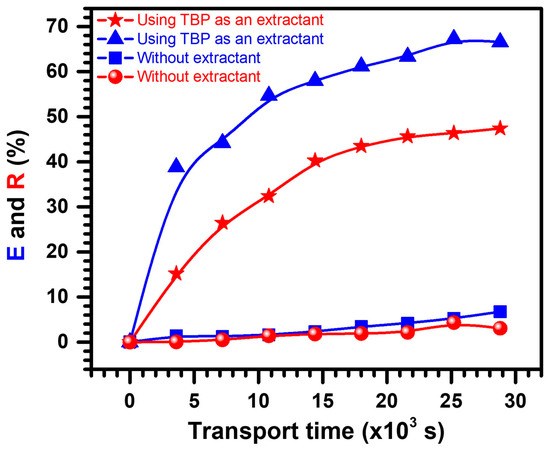 The variation in E (%) and R (%) during the 8 h of transport is shown in Figure 2. The presence of the carrier (TBP) in the polymeric support leads to a noticeable improvement in the transport of the PNA from the feed to the receiving phase. The E (%) and the R (%) increase from 6.743 to 68.169 and from 3.053 to 49.2226, respectively, with and without impregnation. Moreover, after 8 h, the transport stops and the E (%) and R (%) remain constant. This behavior could be related to the carrier’s loss from the membrane. There is a possibility that carrier losses are related to its solubility (solubility of TBP in water is 0.4 g L−1 at 25 °C), as membrane liquid (ML) is not completely insoluble in an aqueous solution and some solubility exists at the ML/aqueous solution interface. This influence can be significant if ML is highly soluble in nearby aqueous solutions [31,32]. In their study of TBP-mediated transport of phenol, Huidong et al. showed that emulsion formation was responsible for membrane instability [33]. Based on the thickness , porosity , and tortuosity of Accurel® PP support, the experimental (Jexp) and normalized (JN) fluxes for PNA were calculated (Jexp = 7 × 10−10 and JN = 0.51 × 10−10 mol m−2 s−1) using Celgard 2500 [24,34].