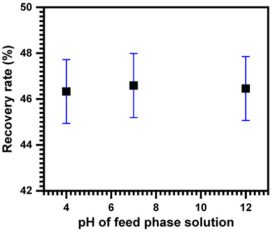 The effect of pH on PNA removal efficiency is shown in Figure 6. The R (%) values are 46.33, 46.59, and 46.46% for pH = 4, pH = 7, and pH = 12, respectively. The obtained values are almost equal. Hence, the initial pH of the donor phase did not influence the transport of PNA through the membrane.
