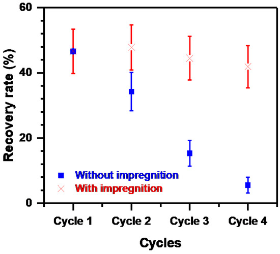 The reusability of the membrane was studied in two manners. Firstly, the stability of the membrane support was carried out by repeatedly using the same membrane support without further impregnation with the liquid membrane. Experimental conditions are as follows: feed phase PNA 20 ppm (pH 7), strip phase distilled water, TBP as carrier, and transport time 8 h. Fresh feed and strip solutions are used in every cycle. A total of 1 mL of each solution is taken after 8 h to find their concentrations. The R (%) calculations during four successive cycles demonstrate that the membrane is unstable. The R (%) decreases significantly from 46.59 to 5.7% for the first and last cycles. This instability could be attributed to the saturation of the membrane with PNA, slow stripping, and marginal leaching of TBP. Secondly, membrane stability was developed by re-impregnating the polymeric support with TBP after each cycle. The same experimental conditions are taken into consideration. Figure 7 reveals that the R (%) remains almost constant. Therefore, re-impregnating the membrane after each cycle improves the performance of the elaborated system. Also, this improvement confirms that the loss of the carrier is one of the reasons causing the system instability.