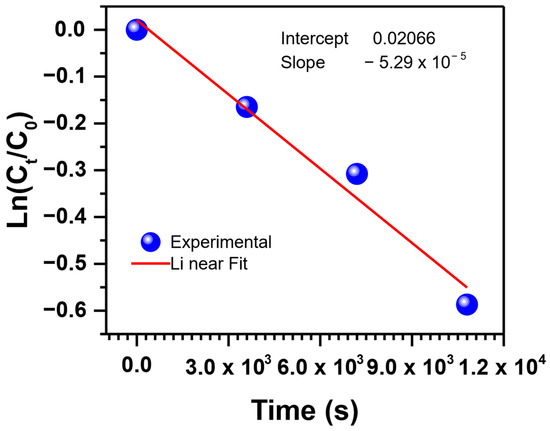 Supported liquid membrane (SLM) transport studies were carried out by extracting PNA under ideal circumstances, 20 ppm (pH 7) of source phase concentration, distilled water in the receiving phase, carrier TBP as the organic phaser, and a duration of 8 h. PNA was extracted at room temperature and atmospheric pressure. Samples from the feed phase were taken every hour and analyzed using UV spectrophotometry. The evaluation of the PNA extraction kinetics under the operational conditions was estimated by fitting the time-course performance data with the first-order linearized reaction by the following equation [46,47]: