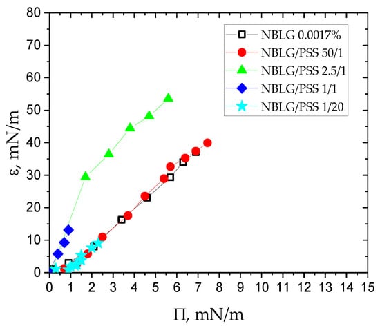The formation of PSS/protein complexes changes the structure of the adsorption layer and it becomes more rigid. The dynamic surface elasticity exceeds the results for native protein solutions at a given surface pressure at the ratios of BLG/PSS mass concentrations approximately in the range 1–2.5 at a BLG concentration of 0.0017 mass % (Figure 1). For example, at a BLG/PSS ratio of 2.5, the surface elasticity of the mixed solution almost exceeds two times the value of the native protein solution. A further increase in the PSS concentration decreases the surface elasticity again, and at BLG/PSS ratios of 50 or lower than about 0.05, all the dependencies of the dynamic surface elasticity on surface pressure almost coincide within the error limits with the results for native protein solutions. In this case, the excess of PSS molecules of low surface activity does not influence the static surface properties, and the activity of the complexes is presumably close to that of the native protein.