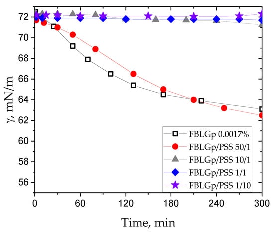 The addition of PSS to protein solutions at pH 2 can decelerate strongly the changes in surface properties, with the surface age indicating the formation of protein/PSS complexes. Despite a decrease in the total charge of the complexes with increasing PSS concentration, the surface properties change slower in this case, presumably due to the formation of large aggregates in the bulk phase (Figures S2 and S3 of the Supplementary Materials). The deceleration of the adsorption kinetics starts when the polyelectrolyte mass concentration exceeds 20% of that of the protein. The deceleration rate depends on the total protein content, and at higher protein concentrations, the adsorption rate starts to change noticeably at lower PSS concentrations (Figure S4 of the Supplementary Materials). At the same time, the increase in the total protein concentration results in the appearance of a slight opalescence of the aqueous dispersion, indicating an increase in the concentration of relatively large aggregates.