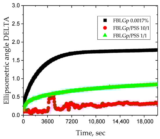 Kinetic dependencies of the ellipsometric angle DELTA for FBLGp/PSS dispersions at pH 2, a fixed FBLGp mass percentage of 0.0017%, and FBLGp/PSS mass ratios 10/1 (red circles) and 1/1 (green triangles). Black squares correspond to pure FBLG.